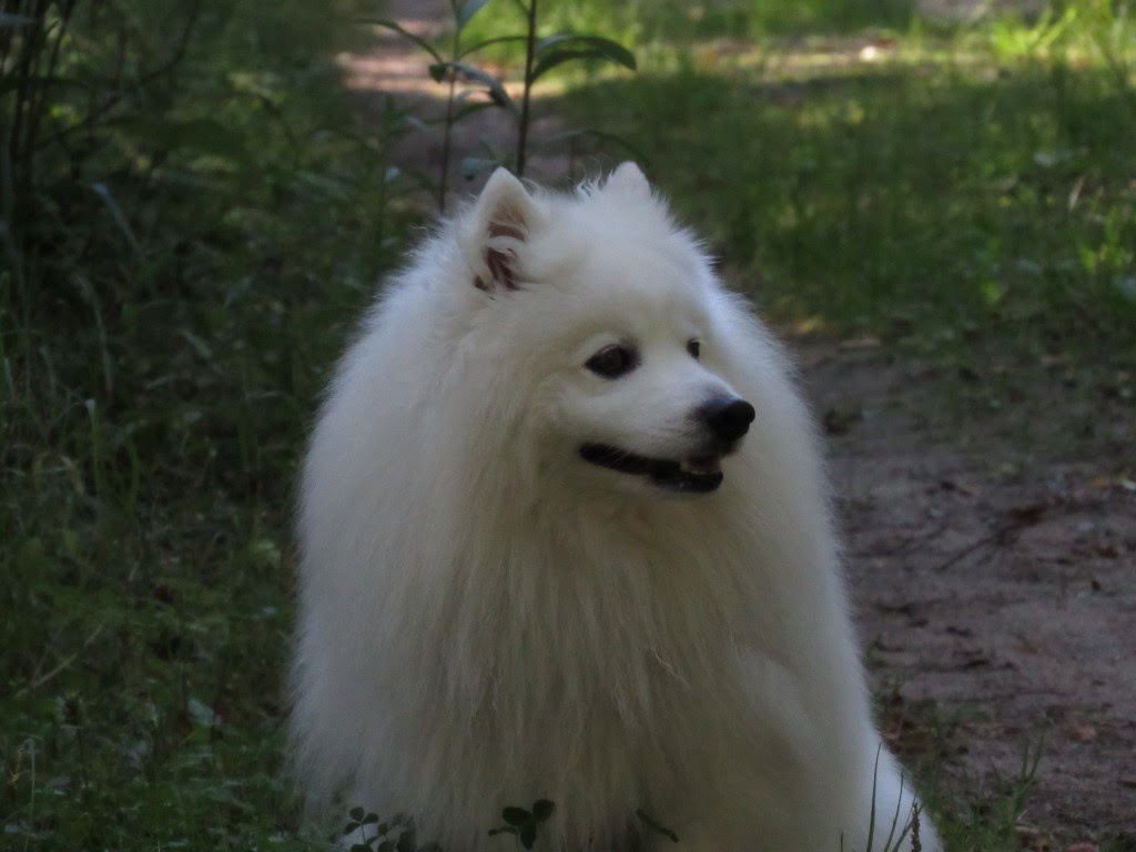 Mustikka- ja sienimetsällä ei juuri valokuvia tullut otettua, tai jos tuli, ei niissä näy juuri muuta kuin valkoinen karvakasa nenä maassa tai jo kääntyneenä johonkin toiseen suuntaan. Edi on jo ennen Bonon tuloa välillä metsässä vapaana ollessaan tehnyt pieniä retkiä ja kadonnut jonnekin, kun hetkeksi on silmä välttänyt. Tulee se kyllä suhteellisen pian takaisin kun huutelee. Nyt pojat teki retkiä kahdestaan ja pienen huuhtelun jälkeen loikkivat peräkanaa takaisin. Kiva nähdä, että ne tuntuu viihtyvän yhdessä ja juoksevat yhdessä, vaikka Edi onkin vähän jäyhä tosikko eikä aina ole kovin innostunut Bonon riehumisesta.